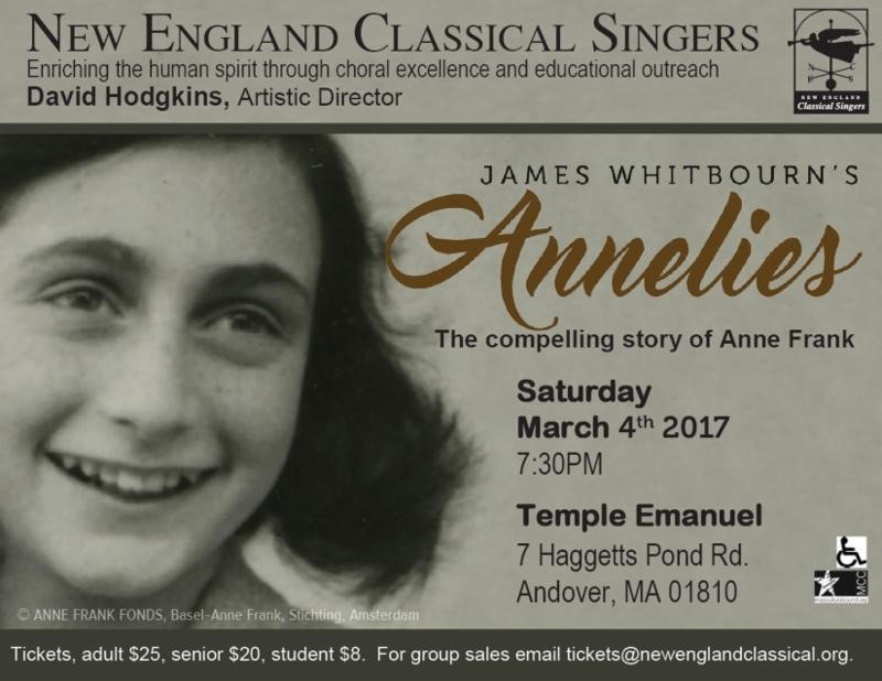 Please join the New England Classical Singers, the NECS Chamber Ensemble, and guest soloist Elissa Alvarez as we explore the compelling story of Anne Frank as told through the music of James Whitbourn's Annelies.