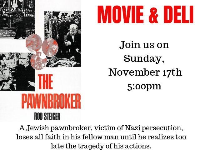 Join us for a Movie & Deli featuring The Pawnbroker. $15 per person includes deli supper. RSVP to the Temple Office by November 14.